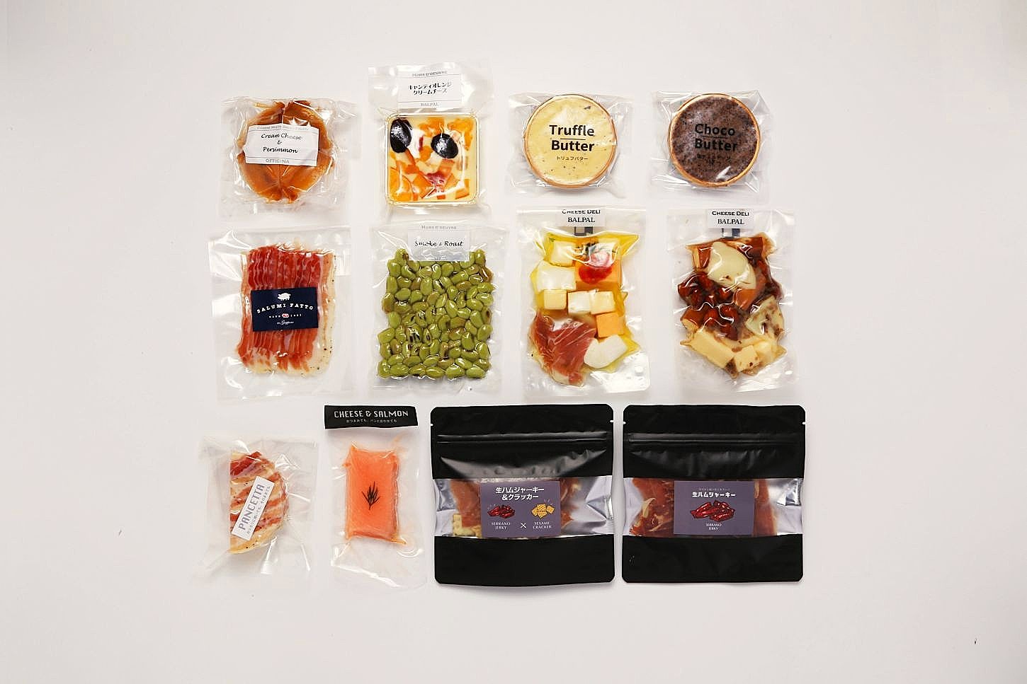 柿クリームチーズ 60g、キャンディオレンジ&クリームチーズ 40g、トリュフバター 38g、塩チョコチップバター 38g、生ハム無塩せきパンチェッタ(スライス)35g、えだまめ燻製 58g、3種のナチュラルチーズ&生ハム 115g、3種スモークチーズ&いぶりがっこ 115g、カマンベール&パンチェッタ 65g、クリームチーズのスモークサーモン巻 30g、生ハムジャーキー&セサミクラッカー 20g、生ハムジャーキー 15g